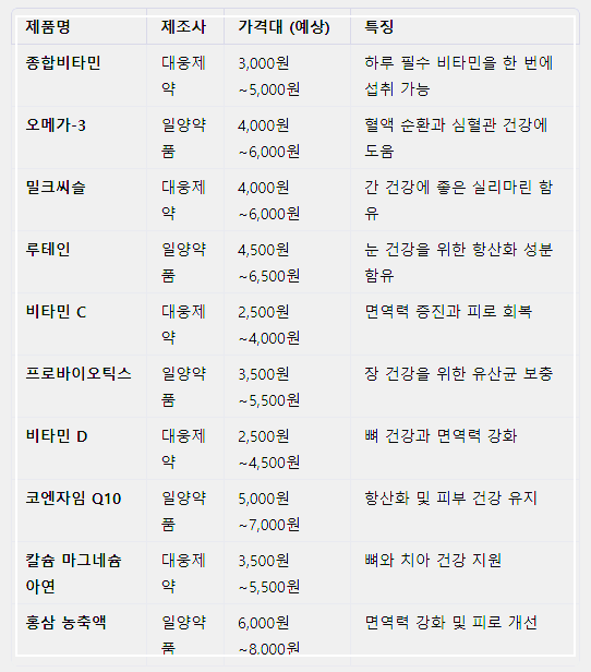 주요 제품으로는 종합비타민, 오메가-3, 밀크씨슬, 루테인 등이 있으며, 가격은 한 달 분량 기준으로 3,000원에서 5,000원 사이입니다.